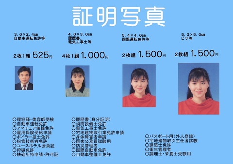 | 証明写真 | 40mm×30mm 4枚 1,000円 |